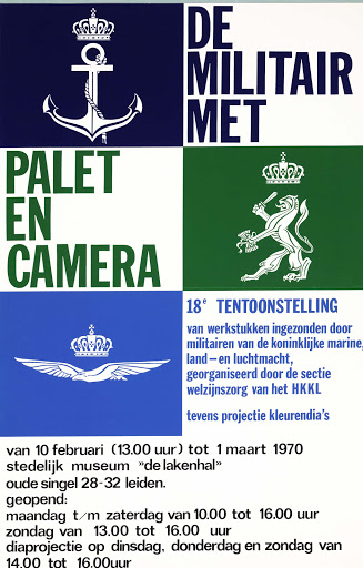 De militair met palet en camera. 18de tentoonstelling van werkstukken ingezonden door militairen van de koninklijke marine land- en luchtmacht, georganiseerd door de sectie welzijnszorg van het HKKL. Tevens projectie kleurendia's - 14 februari - 15 maart