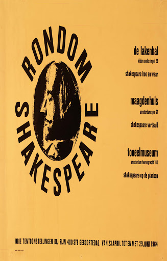 Rondom Shakespeare. Drie tentoonstellingen bij zijn 400ste geboortedag. Lakenhal: Shakespeare hoe en waar. Maagdenhuis: Shakespeare vertaald. Toneelmuseum: Shakespeare op de planken - 13 juni - 13 juli